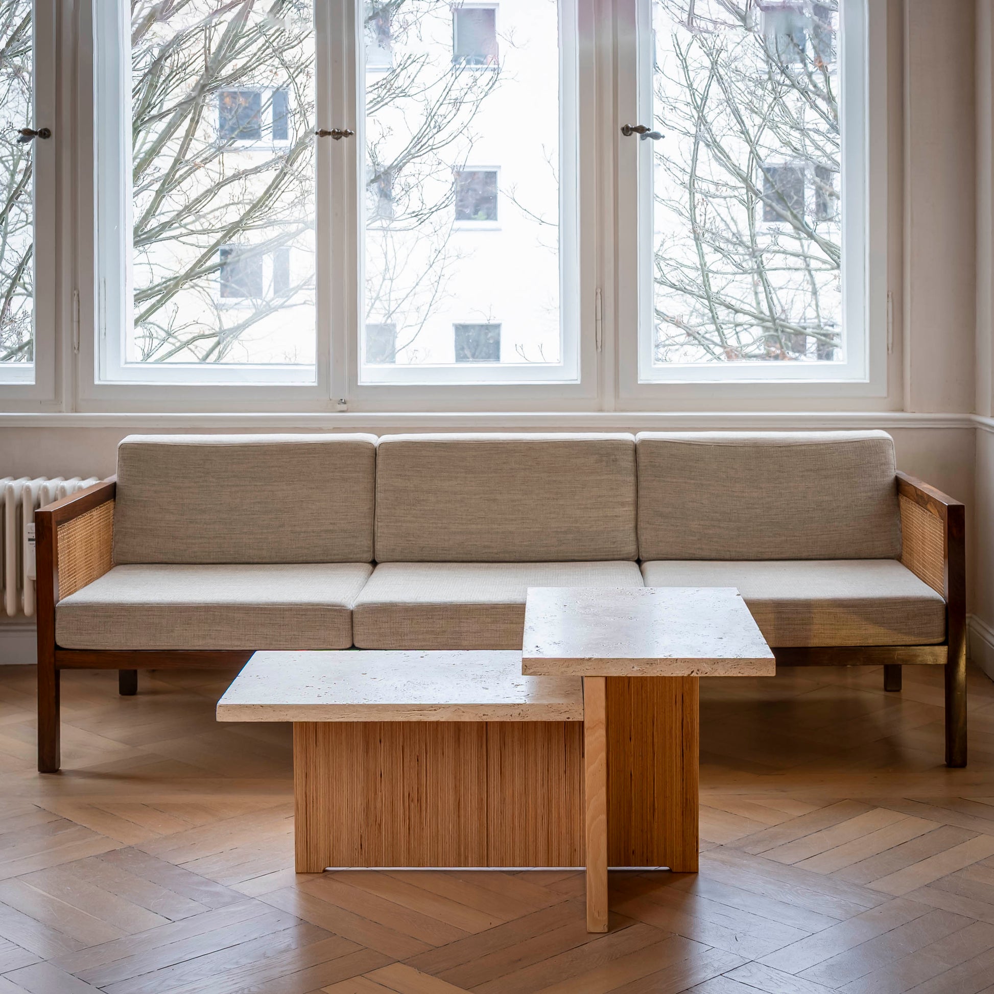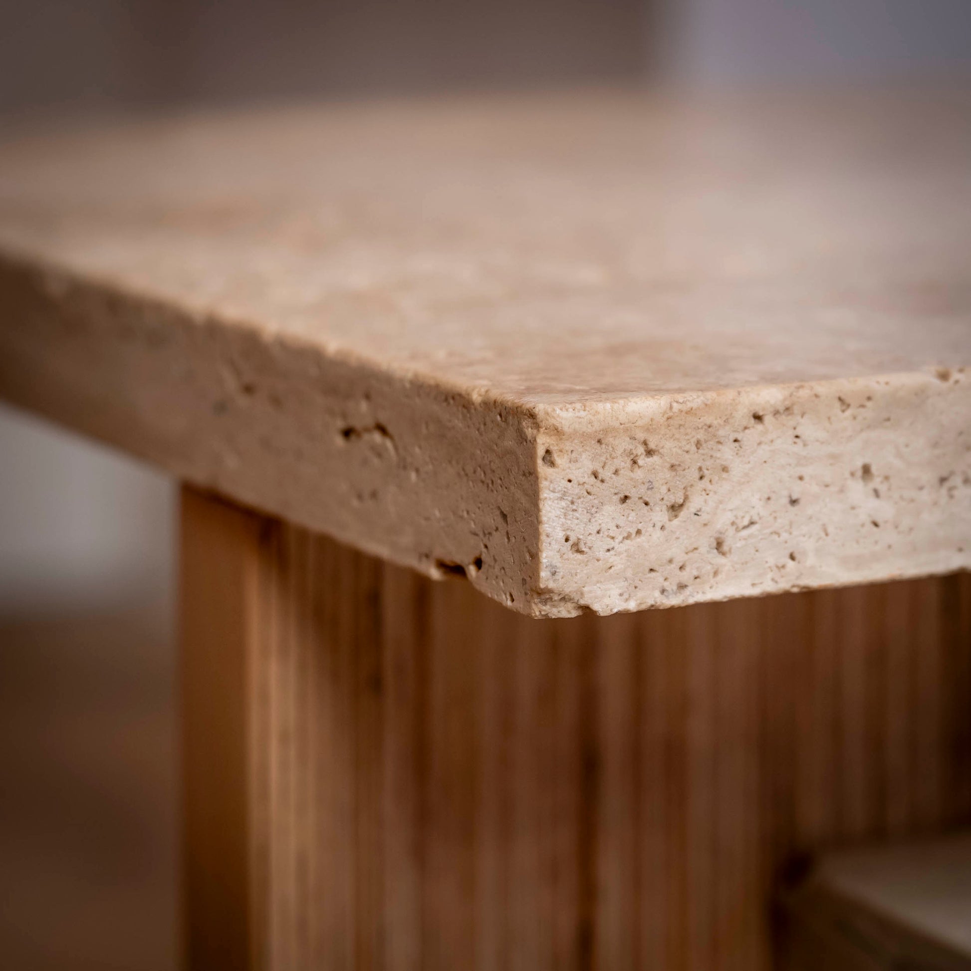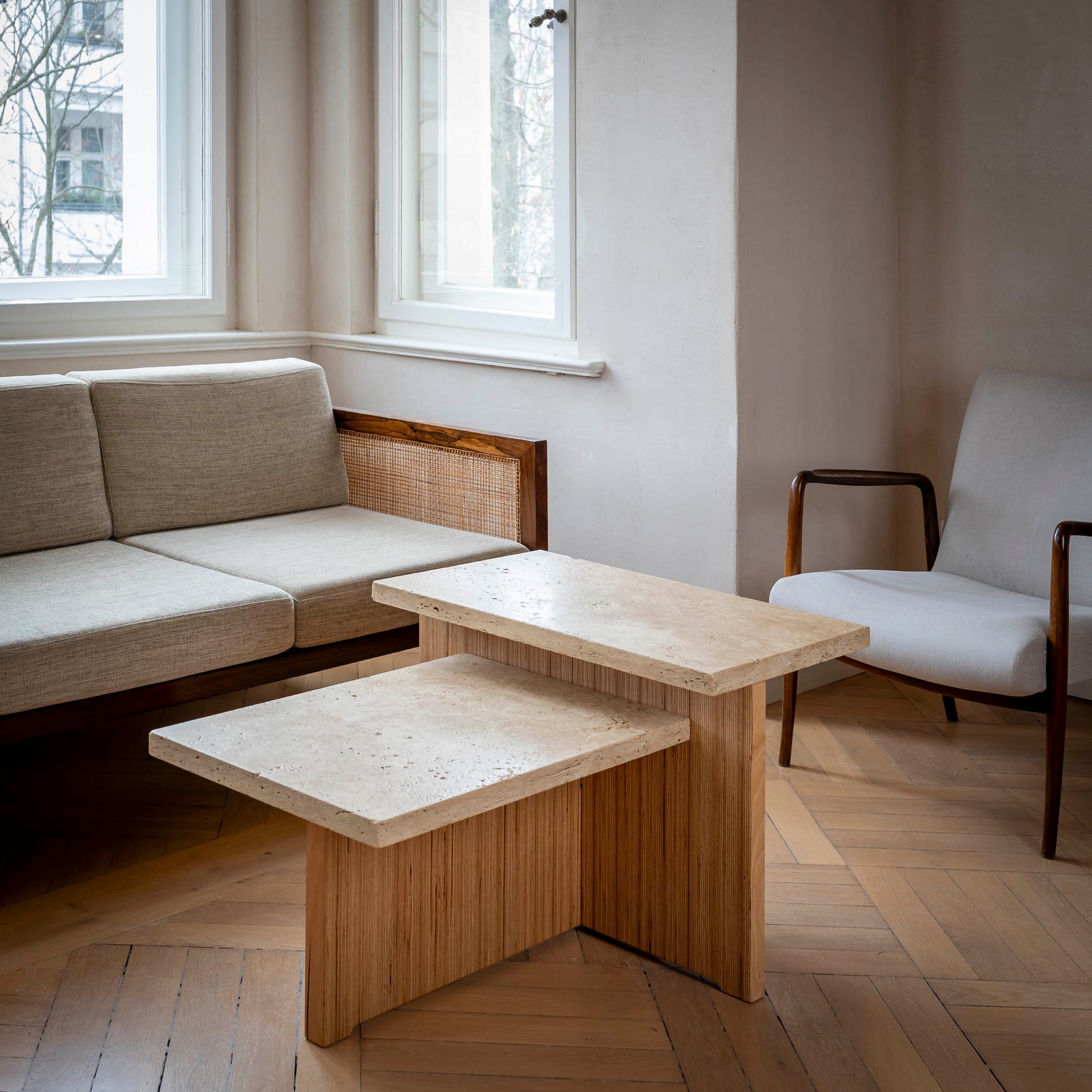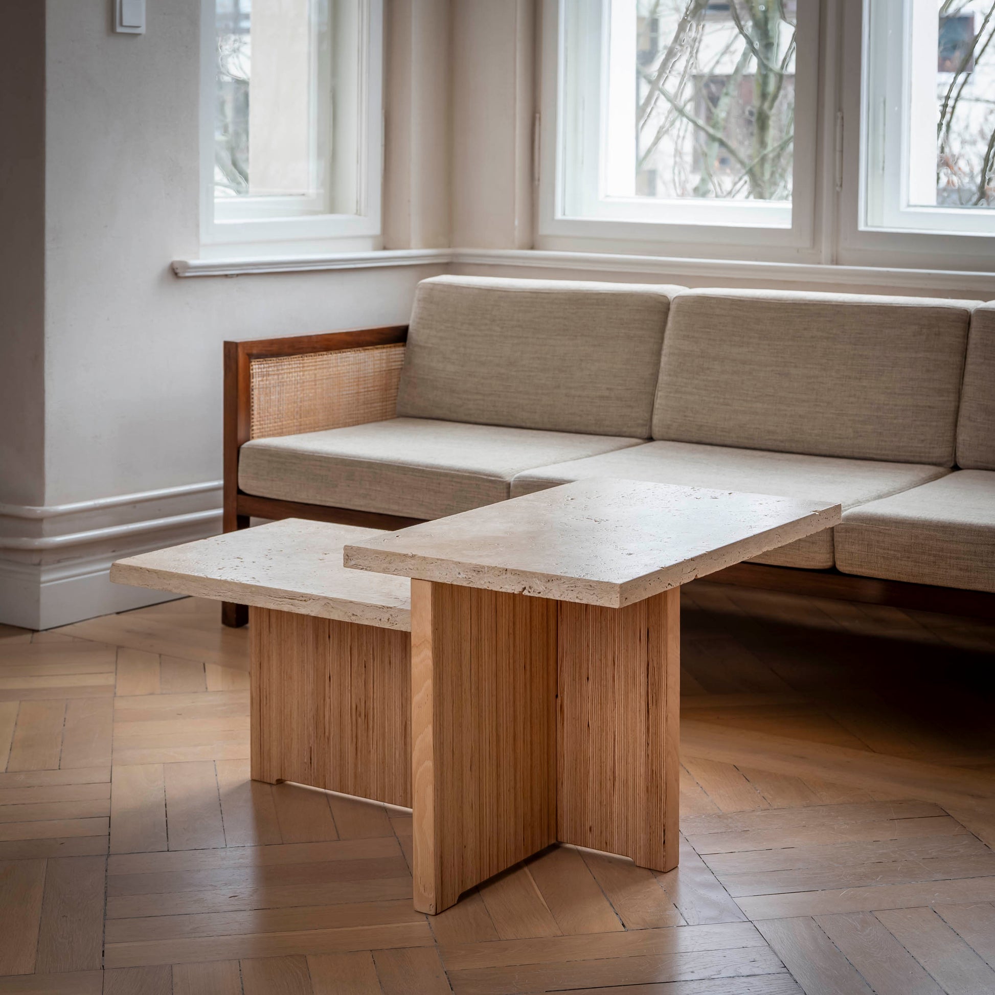Der Couchtisch verbindet massives Holz mit natürlichem Stein. Das stabile Holzgestell aus verleimtem Buchenholz trägt eine Travertinplatte mit offener Struktur, wodurch der Tisch eine zurückhaltende Präsenz im Raum entfaltet. Harmonische Proportionen sowie die Kombination aus warmem Holz und kühlem Stein verleihen ihm eine zugleich bodenständige und hochwertige Wirkung.