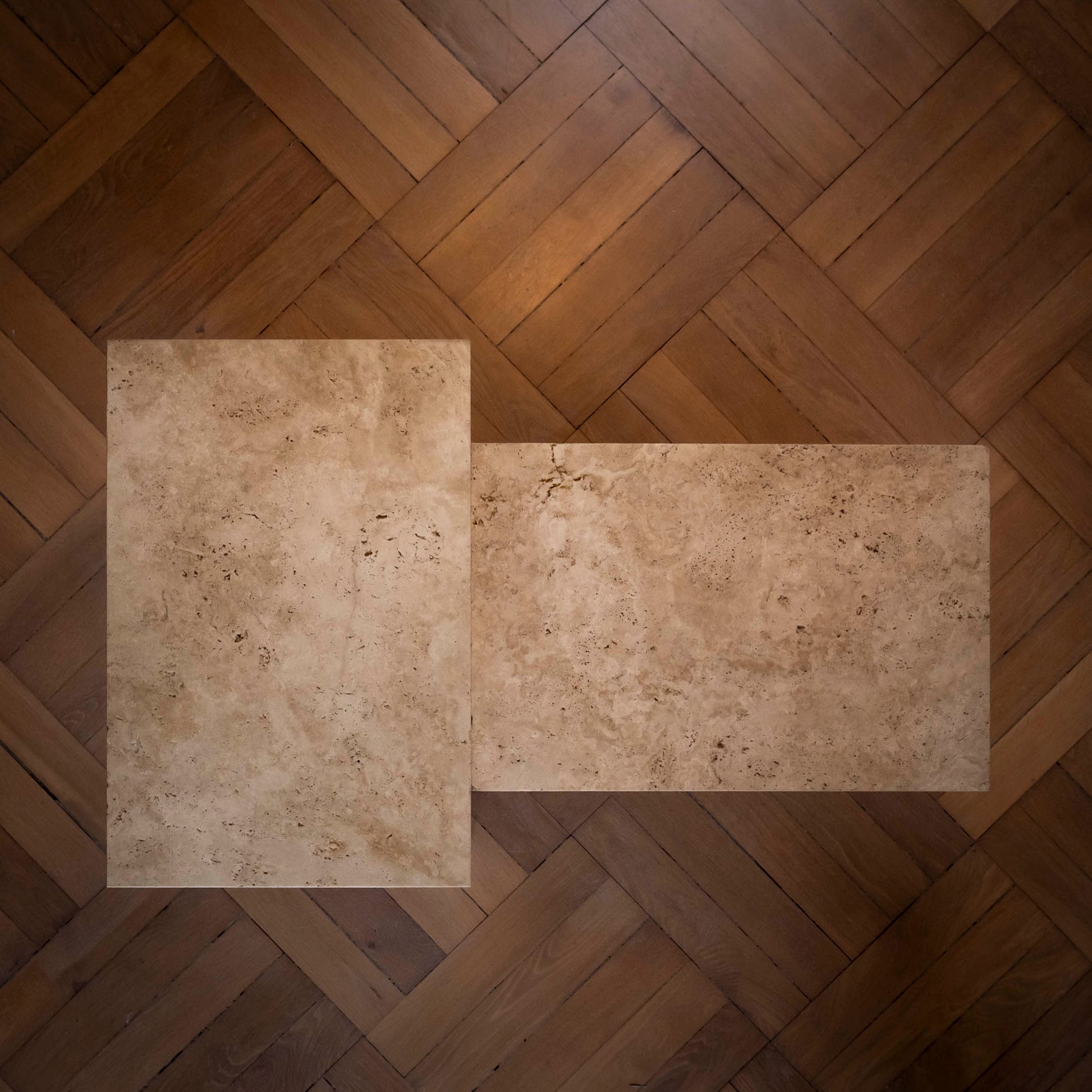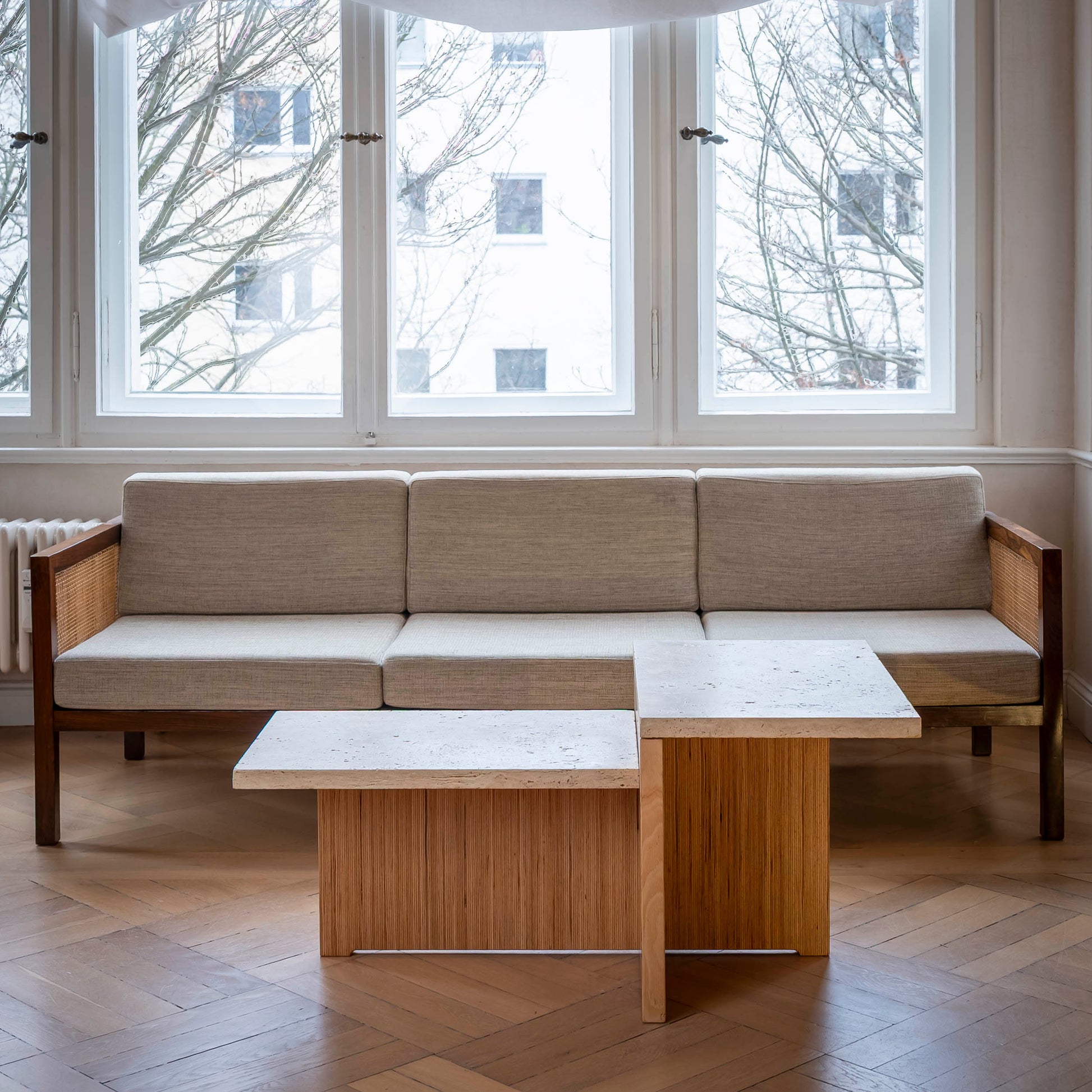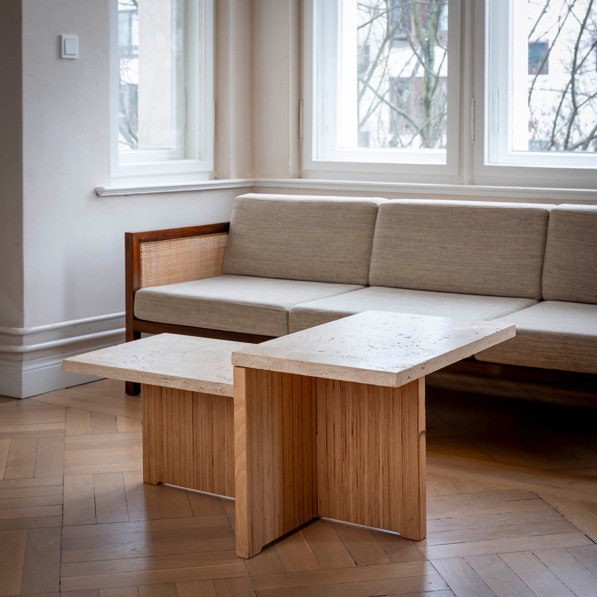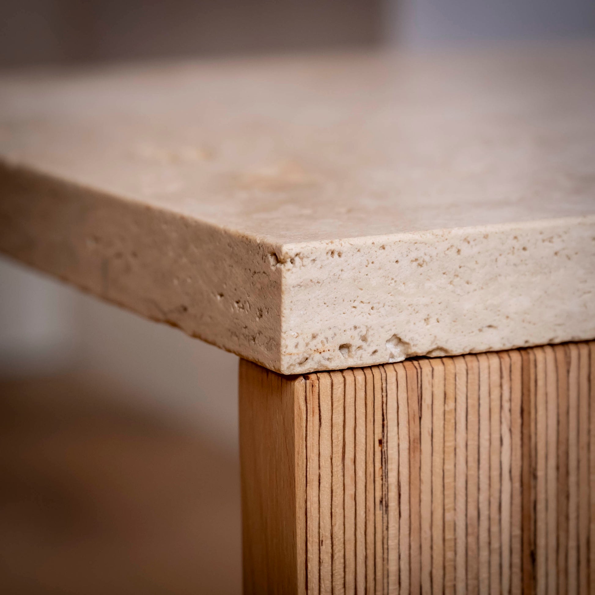 Der Couchtisch verbindet massives Holz mit natürlichem Stein. Das stabile Holzgestell aus verleimtem Buchenholz trägt eine Travertinplatte mit offener Struktur, wodurch der Tisch eine zurückhaltende Präsenz im Raum entfaltet. Harmonische Proportionen sowie die Kombination aus warmem Holz und kühlem Stein verleihen ihm eine zugleich bodenständige und hochwertige Wirkung.